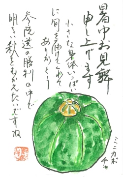 暑中見舞いのお葉書いただきました。ぷっくりと太ったミニカボチャがとても鮮やかに描かれていて、うれしいです。心のこもった暑中見舞い、ありがとうございます。暑い日が続いていますので、みなさん体調に気を付けて