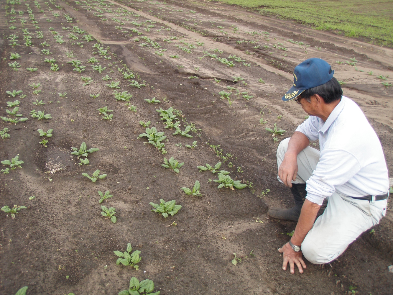 写真は横芝光町の布施裕康さん。流された縮みホウレン草をみて、がっかりです。残った縮みホウレン草に頑張ってほしいものです。