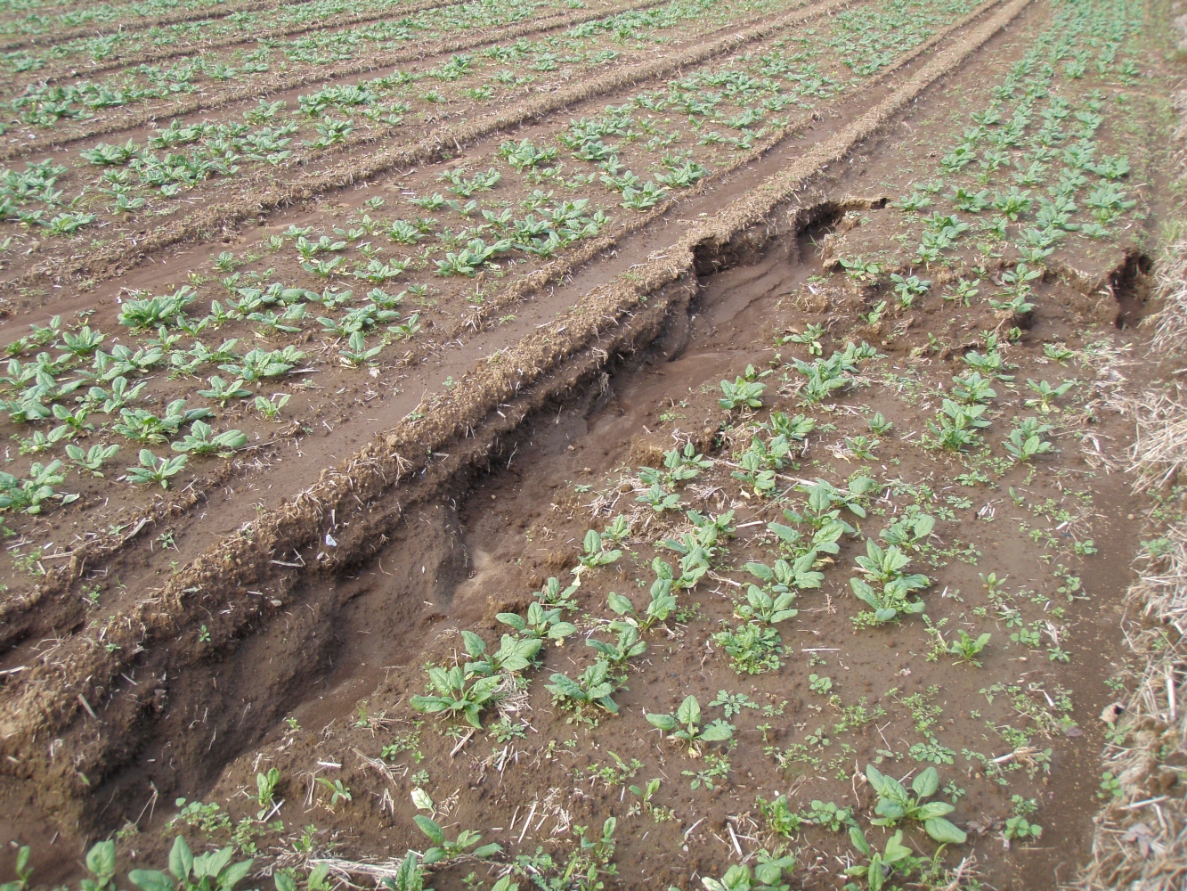 先日の台風の際、大量の雨で畑の土が流されたところが多くあります。こちらは縮みホウレン草の畑です。畑の中に川ができてしまい、土がえぐれてしまいました。