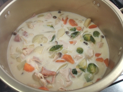 2月18日横芝光町の町民会館で行われた、米粉の料理講習会に参加してきました。今回は米粉のシチューと米粉のカスタードクリーム。シチューはルーの代わりに米粉を牛乳で溶いて加えるのですが、火にかけるととろみが出てきました。旬の芽キャベツが入って美味しそう。参加しているみなさんが協力してくれて、あっという間にできました。