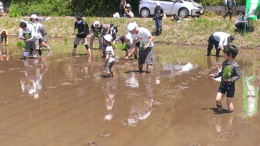 5月18日 成田市で千葉新婦人の田植え交流会が開催されました。房総食料センターからは野菜の販売で参加しました。お天気に恵まれ、温んだ水に素足を入れ、いざ田植えです。