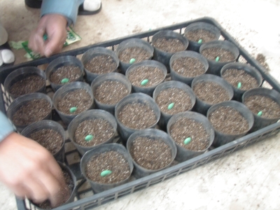 いんげん豆の種は土の中に埋めるのですが、そらまめのたねは半分ほど地表に出しておきます。