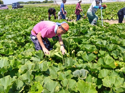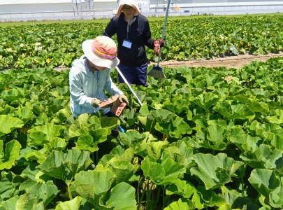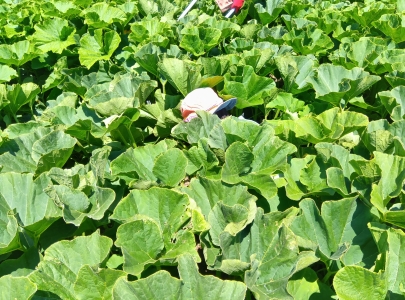 歩きづらいのに加えて、ほうきのを使って葉を痛めないようにかぼちゃを探す作業に、